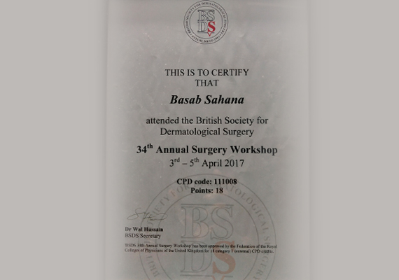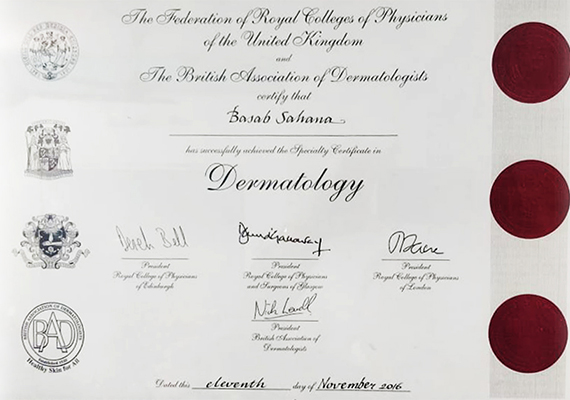 Specialist Certification in Dermatology(Royal College of Physicians, London) Formerly Chief Medical Officer(Directorate General of Armed Forces Medical Services) & Consultant Dermatologist Chelsea & Westminster University Hospital N.H.S.(London) & Specialist Dermatologist, Southport Hospital, N.H.S., U.K.